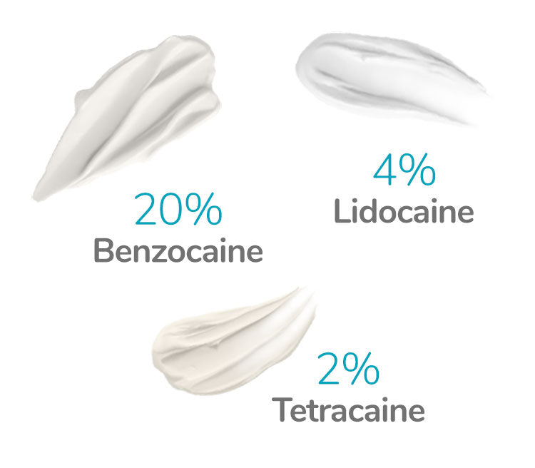 Benzocaine (20% concentration)- Rapid onset, short duration (fast acting). Frequently used anesthetic in many med spas, dermatology offices and dental settings. Is generally well tolerated by most patients.