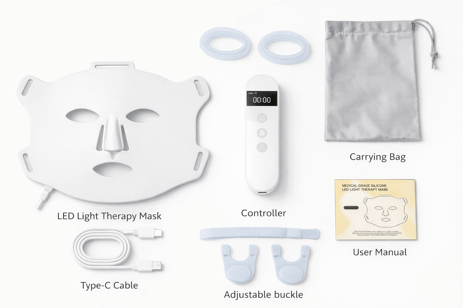 Everything you need for a complete light therapy session in one kit. Includes the medical grade silicone LED mask, digital controller, Type-C charging cable, silicone safety goggles, adjustable straps and buckles, carrying bag, and user manual for easy setup and use.